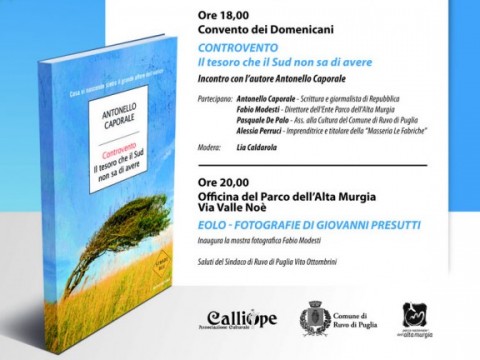 Antonello Caporale, giornalista di Repubblica, ha scritto questo libro edito da Mondadori; l’associazione Calliope lo presenta a Ruvo. Contestualmente vi è questa mostra fotografica di Giovanni Presutti sull’eolico, presentata da Enzo Velati.