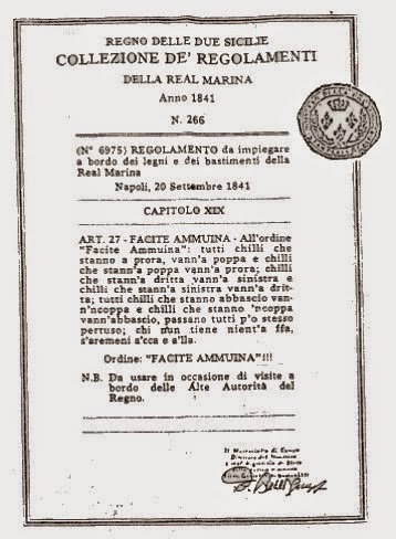 “All’ordine Facite Ammuina: tutti chilli che stanno a prora vann’ a poppa e chilli che stann’ a poppa vann’ a prora; chilli che stann’ a dritta vann’ a sinistra e chilli che stanno a sinistra vann’ a dritta; tutti chilli che stanno abbascio vann’ ncoppa e chilli che stanno ncoppa vann’ bascio passann’ tutti p’o stesso pertuso; chi nun tene nient’ a ffà, s’ aremeni a ‘cca e a ‘llà“.