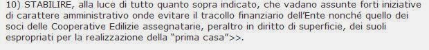 10) STABILIRE, alla luce di tutto quanto sopra indicato, che vadano assunte forti iniziative di carattere amministrativo onde evitare il tracollo finanziario dell’Ente nonché quello dei soci delle Cooperative Edilizie assegnatarie, peraltro in diritto di superficie, dei suoli espropriati per la realizzazione della “prima casa”>>.