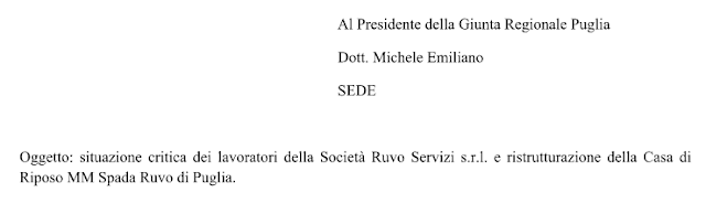 E siccome evidentemente dal consiglio non spera molto, eccolo appellarsi direttamente a Emiliano: al Presidente della Regione Puglia per attivazione del tavolo politico e tecnico in ordine ai Licenziamenti della Società Ruvo Servizi s.r.l. e ristrutturazione della Casa di Riposo MM Spada di Ruvo di Puglia.