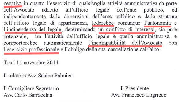 È incompatibile – sembra stabilire il parere dell’Ordine degli Avvocati di Trani, inviatoci da chi si oppone.