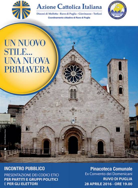 Nel corso dell’iniziativa, fissata per il prossimo 28 Aprile, l’Azione Cattolica – Diocesi di Molfetta, Ruvo, Giovinazzo e Terlizzi – presenterà i “Codici Etici” per elettori e partiti/movimenti politici.