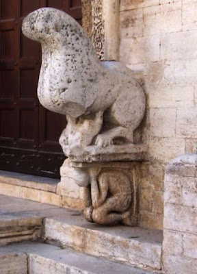 Ne troviamo un magnifico esemplare (anzi due) proprio sulla facciata della nostra cattedrale romanica: il telamone, con la testa curva, piegato su sé stesso dalla fatica, porta e sopporta da decenni il gigantesco leone stiloforo, comodamente accoccolato sulle sue spalle.
