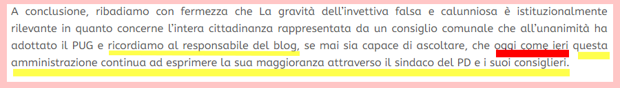 Da qui il pizzino: non si illuda il “responsabile del blog“, il sindaco è roba nostra. Comandiamo noi, ieri come oggi. Praticamente una chiamata di correo per l’incolpevole Chieco.