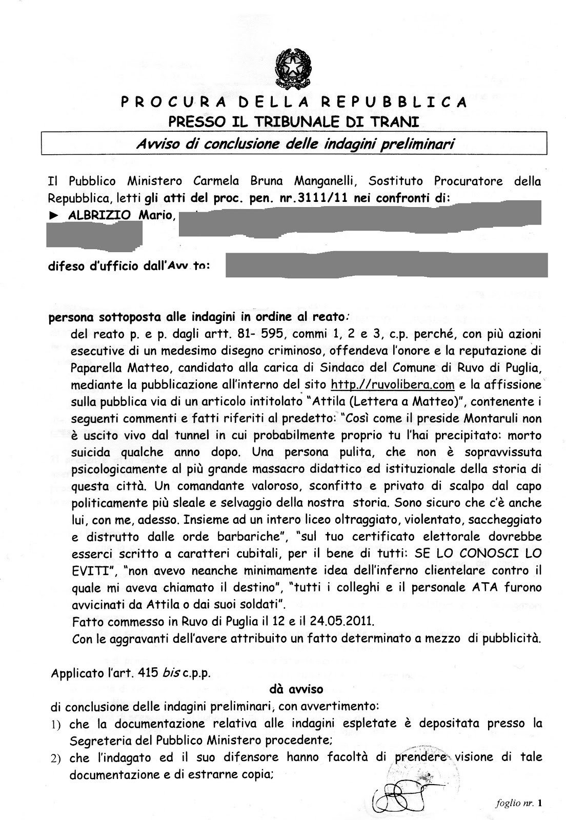 On 24 March 2012 By RuvoLibera In albrizio, attila, liberazione, matteo, politica, querela, ruvo